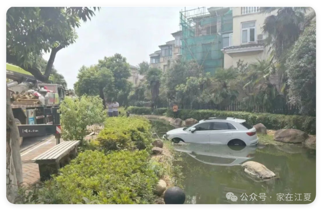 事發江夏一小區,一轎車直沖小區內池塘...